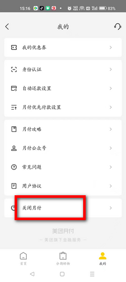 5. 找到“关闭美团月付”按钮,点击即可关闭。